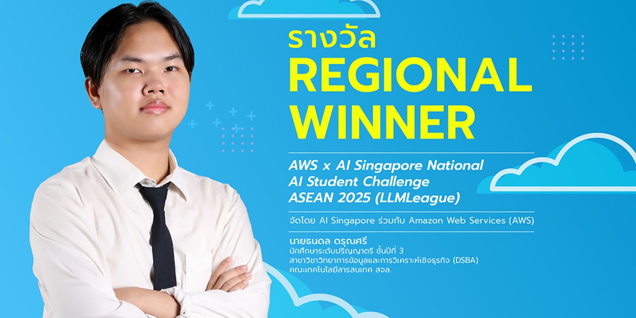 ขอแสดงความยินดีกับ นายธนดล ดรุณศรี นักศึกษาระดับปริญญาตรี ชั้นปีที่ 3 สาขาวิชาวิทยาการข้อมูลและการวิเคราะห์เชิงธุรกิจ (DSBA) คณะเทคโนโลยีสารสนเทศ สถาบันเทคโนโลยีพระจอมเกล้าเจ้าคุณทหารลาดกระบัง กับการเป็นตัวแทนประเทศไทย ไปสร้างชื่อในเวทีระดับภูมิภาค ด้วยการคว้ารางวัลชนะเลิศ ในการแข่งขัน NAISC 2025: National AI Student Challenge ซึ่งจัดขึ้นโดย AI Singapore ร่วมกับ Amazon Web Services (AWS) และได้จัดการแข่งขันในรอบชิงชนะเลิศไปเมื่อวันที่ 29 พฤษภาคม 2568 ภายในงาน ATxSummit: AI Student Developer Conference 2025 ณ ประเทศสิงคโปร์